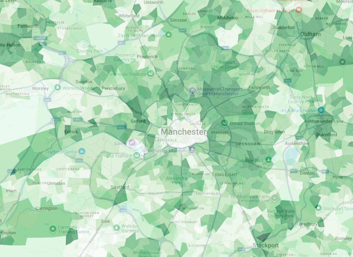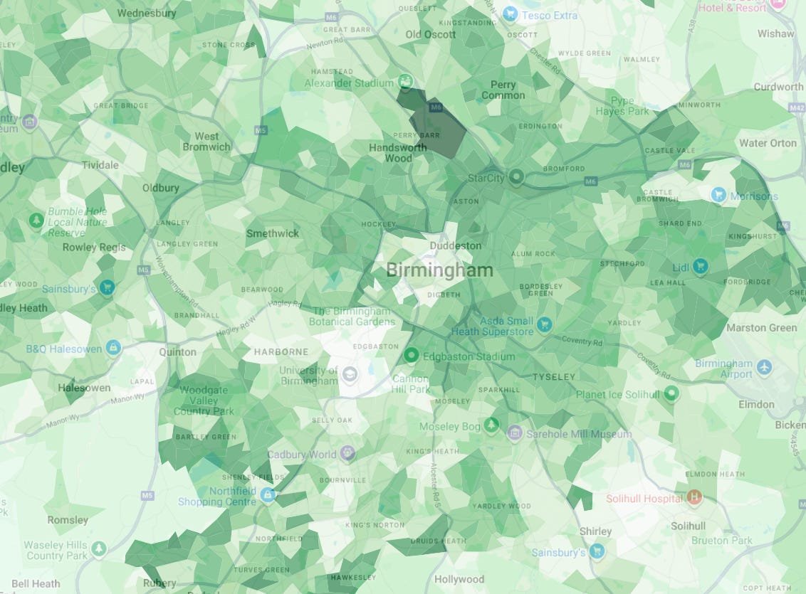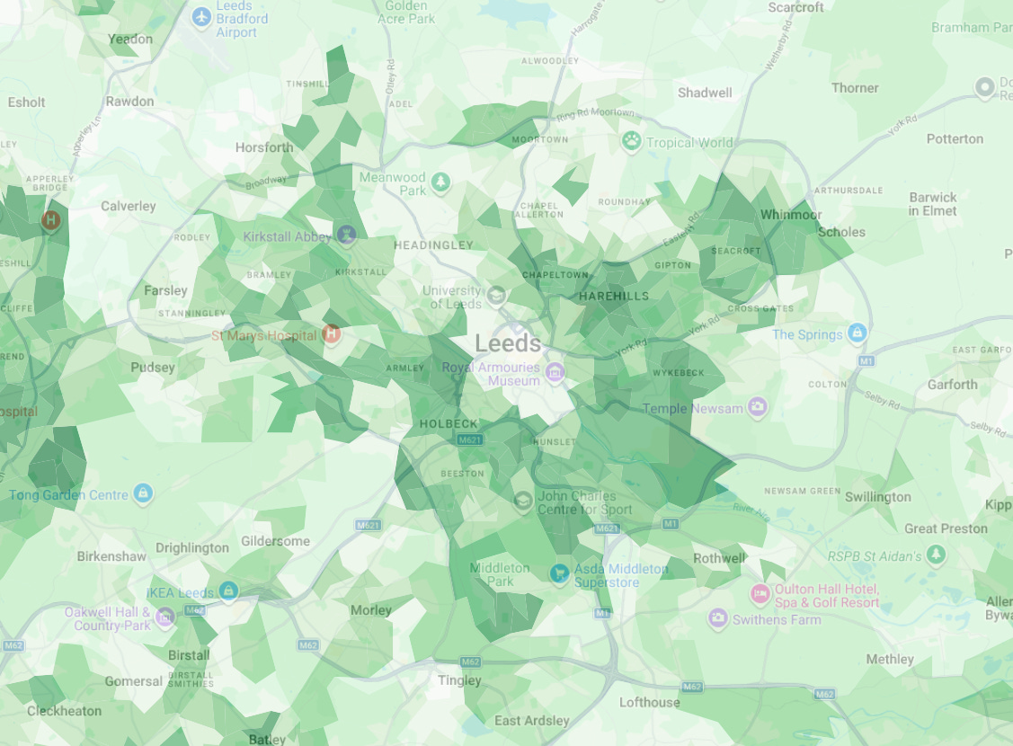 Here is just UC spend per working age person in Birmingham, Leeds and Manchester. As you can see, the very centres of the cities are lighter - the darker green areas indicate larger benefit payments per head. Payments in the very centres are less than £50 per head, but immediately outside the centre it is more like £200 per working age person.