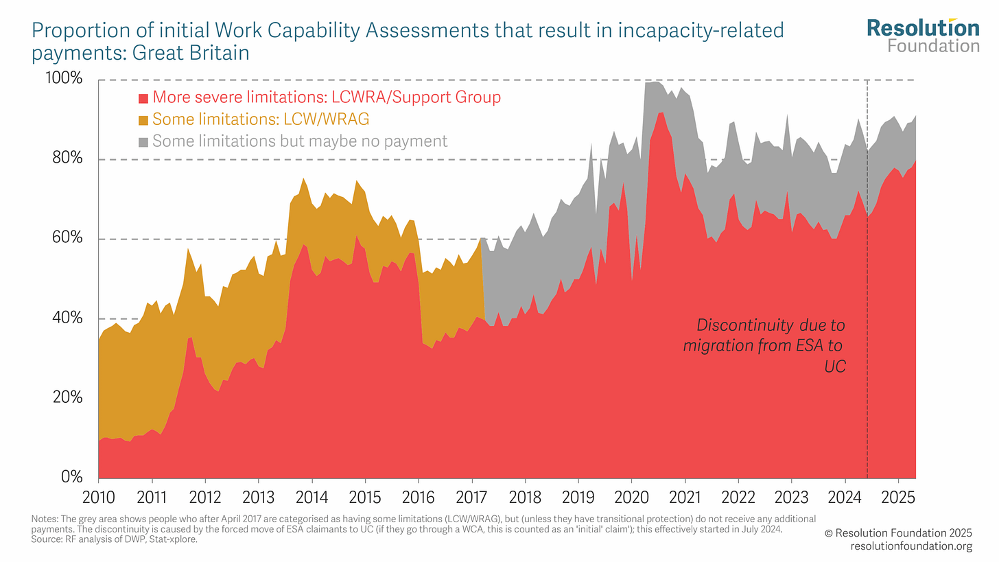 The history of incapacity benefits is a good example of this tendency. Over the last 15 years we have gone from less than 10% being put into the highest payment category to 80% getting it - shown in dark orange below: